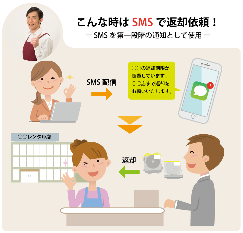 お客様への第一段階の通知としてSMSにて、返却依頼を行います。